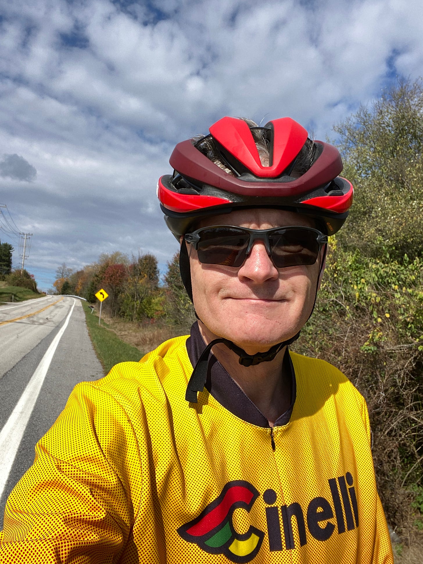 Red helmet, yellow and orange jersey (and a cool Cinelli one at that). I wear lots of yellow, orange and red clothing. Those are colors that shout to drivers “Hey, cyclist over here!” I have some jerseys that are dark, but with a wide white or red stripe across the chest. That also stands out to drivers.