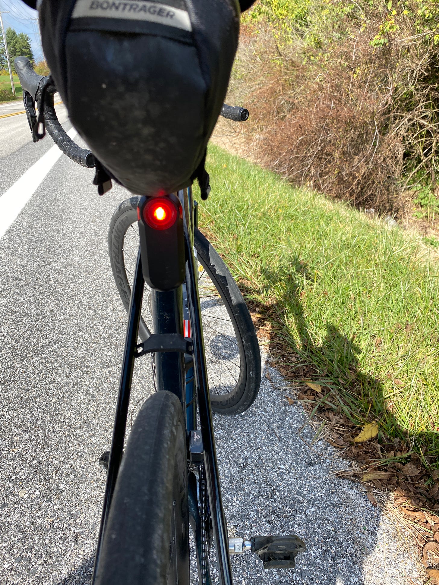 In terms of devices, I have lights both front and rear. The rear one is my Varia radar unit, and I set it to flash. Same as my front Bontrager light. Flashing lights are spotted more easily than solid lights (although those are much better than not having lights at all.)